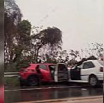 Pelas imagens, é possível ver o momento em que o carro vai parar embaixo do caminhão. O veículo ficou destruído.